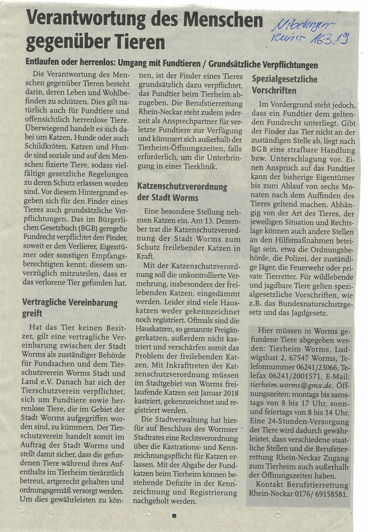 Anbei ein Artikel des Nibelungenkuriers vom 16.03.2019 bezüglich der Fundtierregelung in Worms.