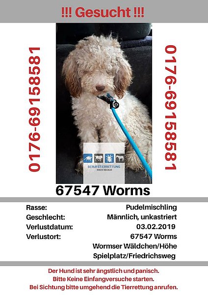 Ein sehr ängstlicher und scheuer Pudelmischling, männlich, unkastriert, ist am 03.02.2019 Nähe Spielplatz im Wormser Wäldchen (Friedrichsweg) weggelaufen.