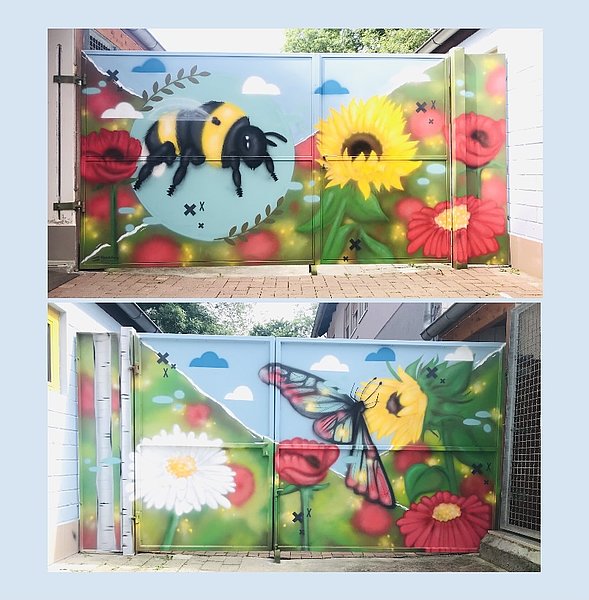 Nachdem Simon schon unseren Hintereingang vor einiger Zeit mit seinen Kunstwerken verziert hat, hat er nun das Tor zum Hunde- und Katzenbereich verschönert.