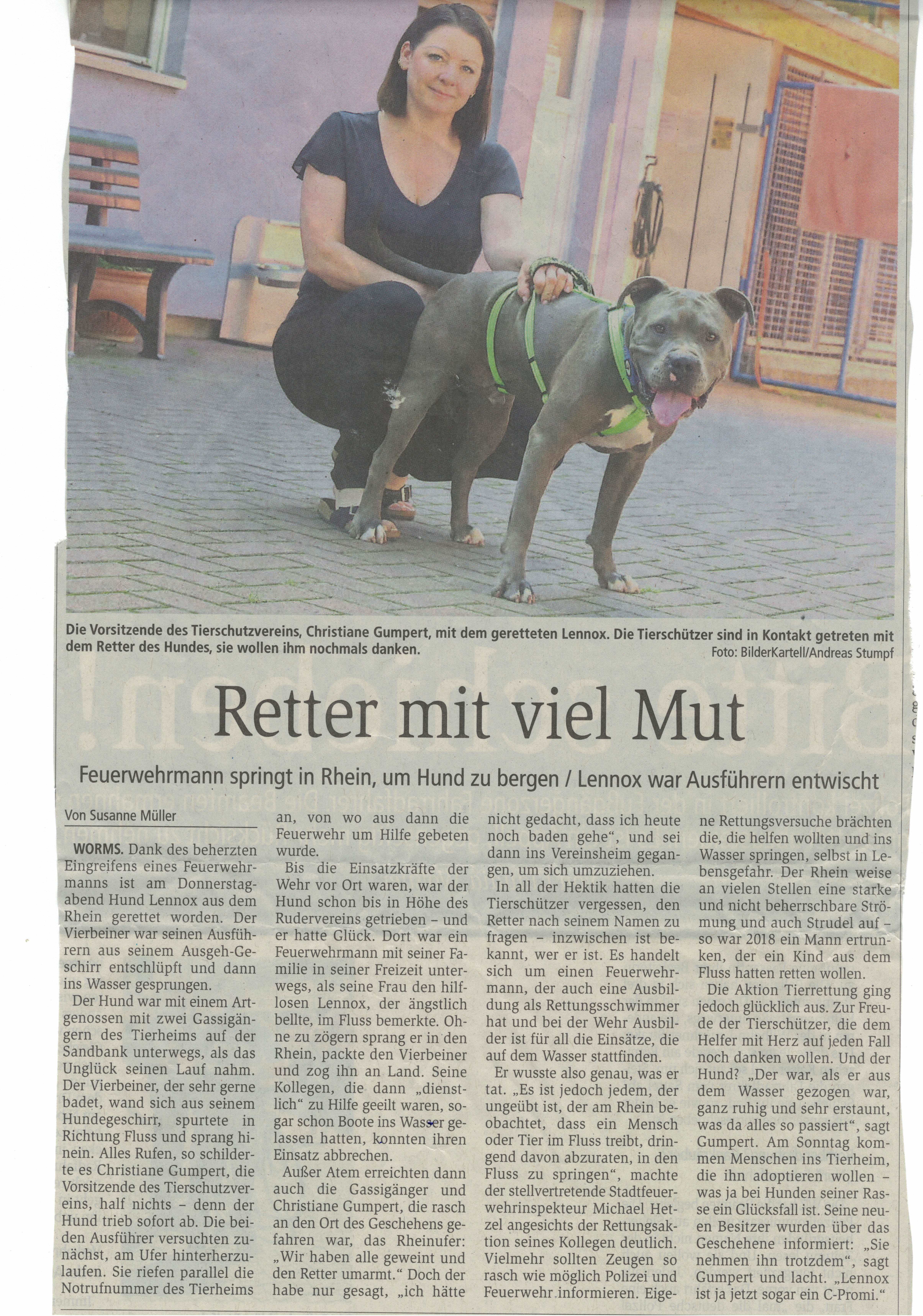 Danke von Herzen an die Feuerwehr Worms, die superschnell am Einsatzort gewesen ist und natürlich an den finalen Retter Andreas F., der Lennox das Leben gerettet hat.