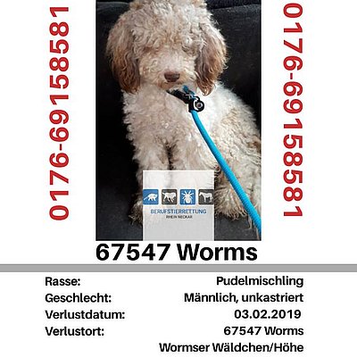 Ein sehr ängstlicher und scheuer Pudelmischling, männlich, unkastriert, ist am 03.02.2019 Nähe Spielplatz im Wormser Wäldchen (Friedrichsweg) weggelaufen.