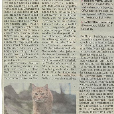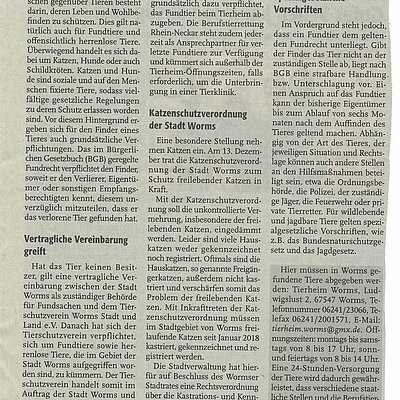 Anbei ein Artikel der Wormser Zeitung vom 01.02.2019 bezüglich der Fundtierregelung in Worms.