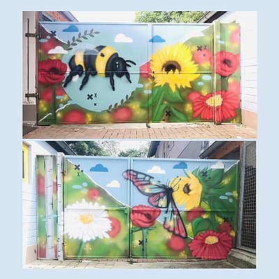 Nachdem Simon schon unseren Hintereingang vor einiger Zeit mit seinen Kunstwerken verziert hat, hat er nun das Tor zum Hunde- und Katzenbereich verschönert.
