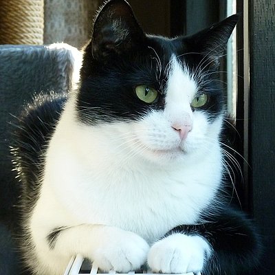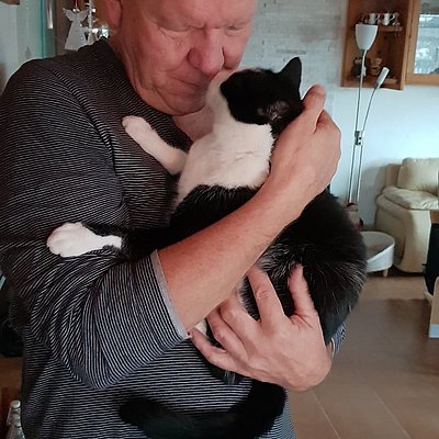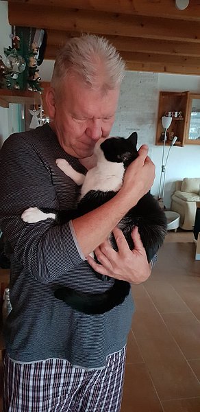 Lorenzo hatte bei uns gelernt, zu vertrauen, und dieses Grundvertrauen in Menschen und in sich selbst nahm er in seine neue Familie mit. Mittlerweile springt der Kater, der im Tierheim vor lauter Menschenscheu unter einem Regal lebte, mit Begeisterung auf den Schoss seiner Menschen, und er liebt es, auf den Arm genommen zu werden und Nasenküsschen zu verteilen.