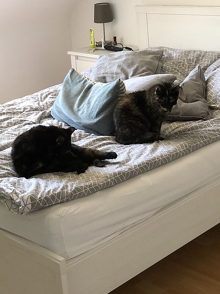 Die beiden haben sich schnell eingelebt & zu unserem Erstaunen sehr schnell geöffnet - von Scheuheit keine Spur mehr. Sogar die Schlafzimmertür haben Sie aufgemacht wenn sie uns so vermisst haben. Seitdem liegt Skyla immer bei uns im Bett & Chilli auf dem Sessel im Schlafzimmer :-).