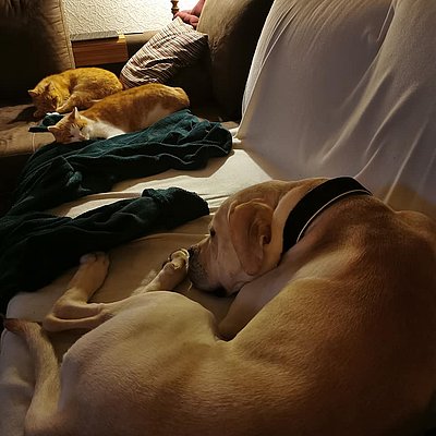 Am nächsten Tag ging es das erste Mal zu uns nach Hause. Denn auch wenn wir uns sicher waren, gab es da noch eine kleine Hürde zu überwinden. Unsere zwei Kater. 13 Jahre alt und gewöhnt, im Mittelpunkt zu stehen. So mancher Hundehalter hat schon die Straßenseite gewechselt, weil die zwei Stress gemacht haben..