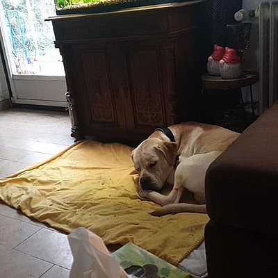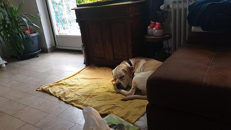 Die erste Nacht hat mein Mann auf der Couch geschlafen, damit das Hundebaby nicht allein ist. Um 3 Uhr morgens ist er halb erstickt aufgewacht. Zwei schöne Häufchen im Flur haben ihn geweckt.. Haha.