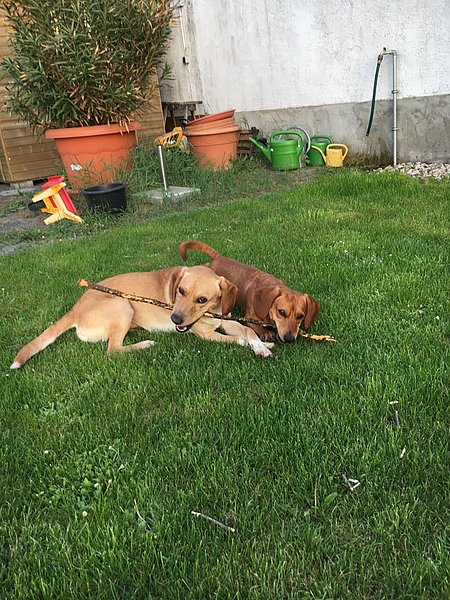 Als wir sie bekamen waren sie noch etwas ängstlich und schreckhaft. Sie kannten nur wenige Grundkommandos. Hier ein Dank an das Team des Tierheim Worms, dass ihnen schon ein bisschen was beigebracht hatte.
