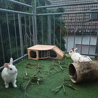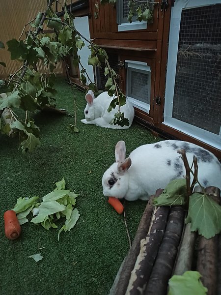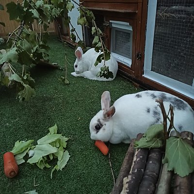 Was das Futter angeht gibt es hier auch ganz tolle Sachen, wie zum Beispiel manchmal ein ganzer Dschungel aus Haselnusszweigen, Weide, Johannisbeer oder auch Bambus in dem man sich neben dem Fressen auch noch prima verstecken kann. Das macht auch immer ganz viel Spaß. Aber am liebsten mag ich ja immer noch Karotten, die könnte ich den ganzen Tag über essen.