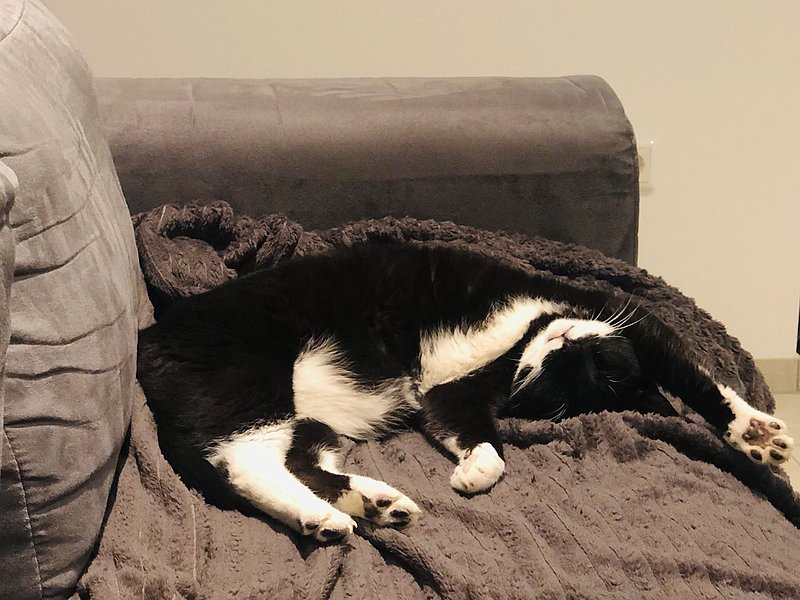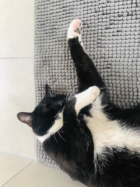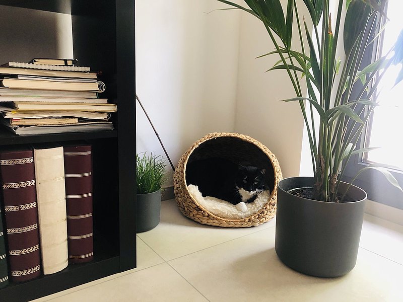 Seine Lieblingsplätze sind die Couch, unsere Badematte oder sein kleines „Wohnzimmer“ (mit Palme, oho!) im Arbeitszimmer. Die Posen sprechen wohl für sich. ;)