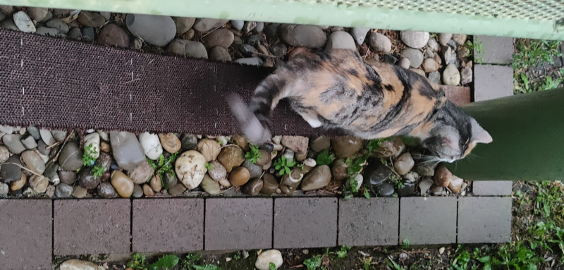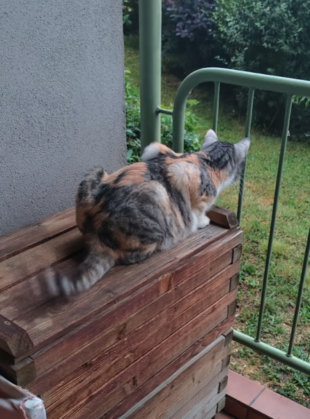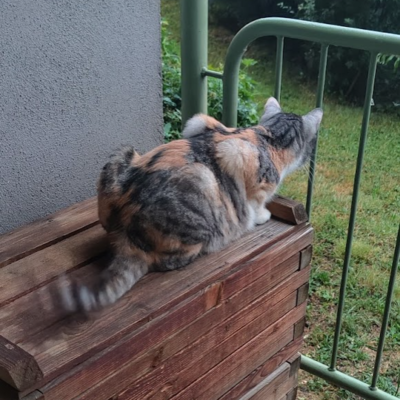 Seit 14 Tagen ist es nun endlich soweit das ich auch ohne Geschirr raus darf, vor allem abends und es macht mir unheimlich Spaß; ich habe eine bequeme Treppe und einen Ausblick vom Balkon auf die ganze Wiese :-).
