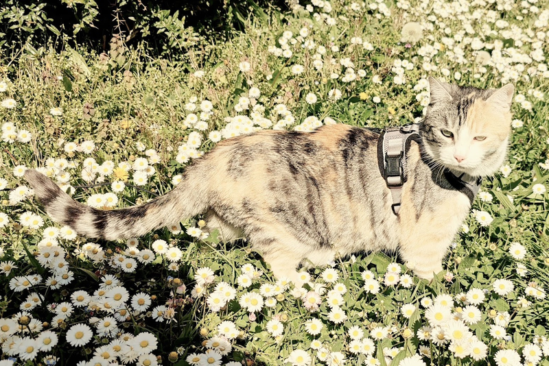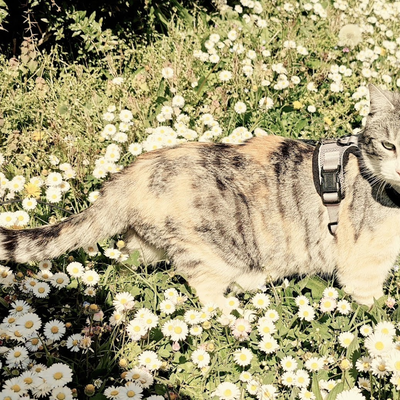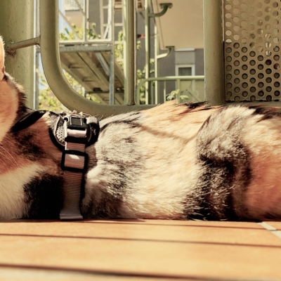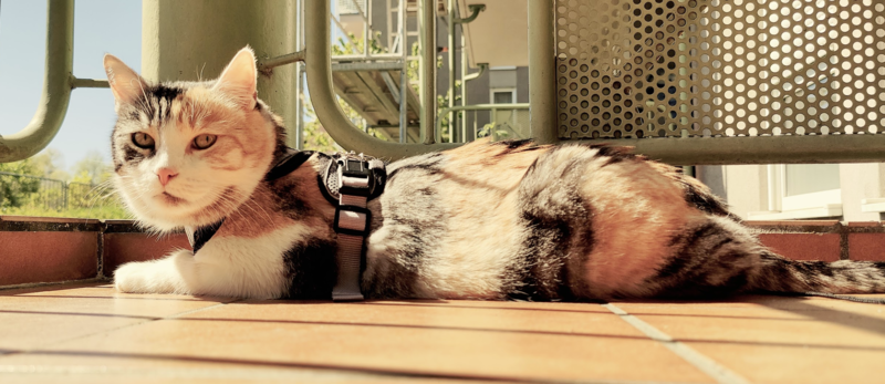 Da ich früher noch nie draussen war, haben wir ganz lange mit einem (doofen) Geschirr geübt, aber ich habe schnell gemerkt das es mich gar nicht so sehr stört und jedesmal wenn ich das Geschirr anbekam ich eine neue Welt entdecken konnte.