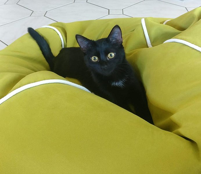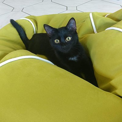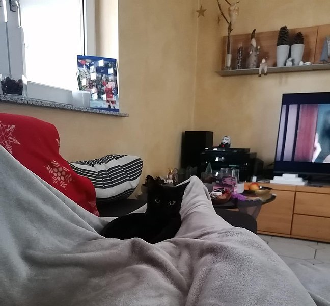 Eigentlich wollten wir einer älteren Katze ein schönes Zuhause bieten, jedoch mussten wir feststellen, dass diese bereits vermittelt wurde. Auf ein Kätzchen waren wir gar nicht eingestellt. Beim Rundgang im Tierheim wurden wir jedoch auf Mochi aufmerksam gemacht und haben uns direkt verliebt. Tatsächlich konnten wir sie kaum sehen, der Käfig erschien zunächst leer. Ganz schüchtern und voller Angst hatte sie sich in der dunkelsten Ecke versteckt, sodass wir nur einen kurzen Moment an Augenkontakt erhaschen konnten. Wir wurden darauf hingewiesen, dass es sich bei ihr um einen kleinen Problemfall handelt. Es war nicht klar, wie gut sie sich bei uns eingewöhnen würde. Frau Vonderheid legte sie uns trotz allem ans Herz, bereits Katzenerfahren und mit schon fast erwachsenen Kindern, wäre es bei uns ruhig und gemütlich. Der perfekte Ort für eine Eingewöhnung. Nach einem Tag Bedenkzeit konnten wir gar nicht anders als die kleine schwarze Katze mit den goldenen Augen bei uns in der Familie aufzunehmen.