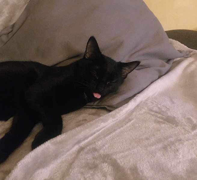 Mochi lässt sich nicht nur streicheln, sie fordert die Streicheleinheiten sogar ein und möchte immer dabei sein, wenn etwas los ist. Beim gemeinsamen Abendessen, beim Lernen oder Entspannen auf der Couch: Mochi ist immer in der Nähe. Nur beim Hochnehmen ist sie weiterhin skeptisch, aber auch daran arbeiten wir zusammen. Sie hat mittlerweile das ganze Haus erobert und streunert ganz fröhlich in der Gegend herum, immer auf der Suche etwas Neues zu entdecken. Sie freut sich schon sehr darauf endlich den Garten kennenzulernen und schaut ganz neugierig aus dem Fenster, aber noch darf sie nicht raus. Denn sie ist trotz allen Fortschritten weiterhin etwas schreckhaft, z.B. bei unbekannten Personen oder auch lauten Geräuschen. Gott sei Dank gibt es Drinnen genug zu spielen! Am liebsten jagt sie rosa Papierknäuel hinterher, die sie durch das ganze Haus kickt und schließlich in ihrem Mäulchen zum Sofa trägt, um sie hinter den Kissen zu verstecken. Auch der tropfende Wasserhahn unserer Badewanne hat es ihr angetan: Fast schon wie hypnotisiert wartet sie teilweise Minutenlang auf den nächsten Tropfen, nur damit dieser wie auf magische Weise im Abfluss verschwindet. Manchmal versucht sie auch die Tropfen zu fangen, aber nasse Pfoten sind dann doch nicht so schön. Die Eingewöhnung ist trotz schwerem Anfang also fast wie im Bilderbuch verlaufen. Unsere kleine schwarze Katze mit den goldenen Augen, die gerne mit rausgestreckter Zunge schläft, möchten wir nie mehr hergeben!