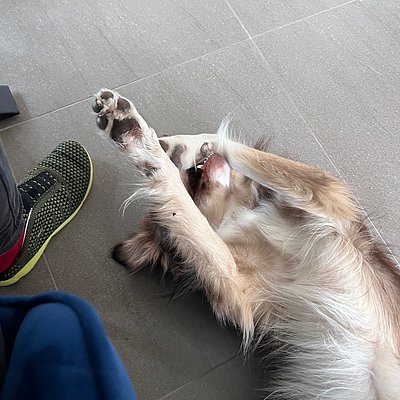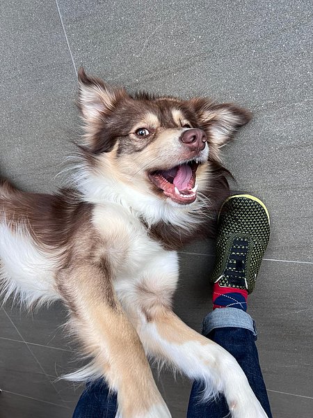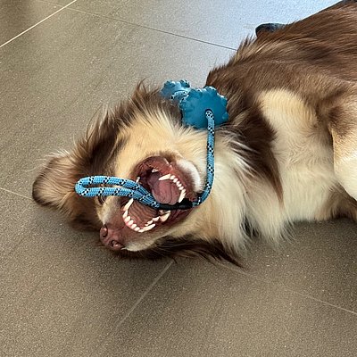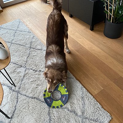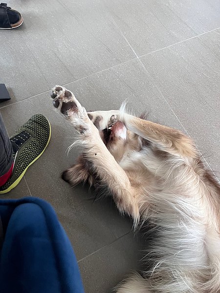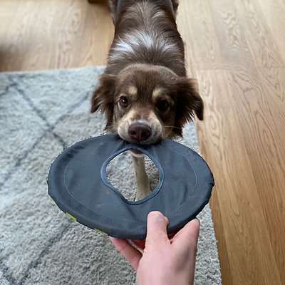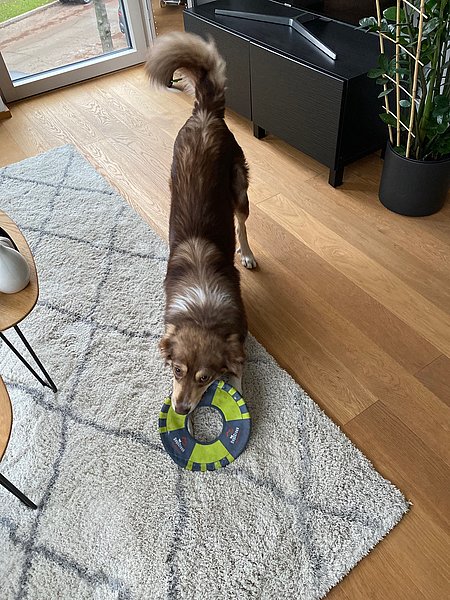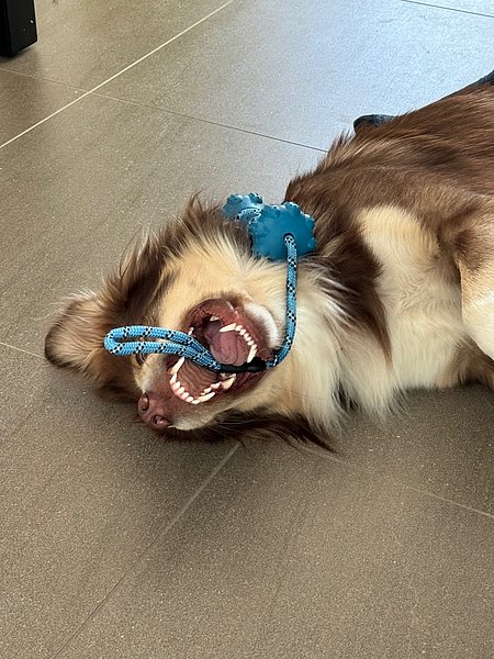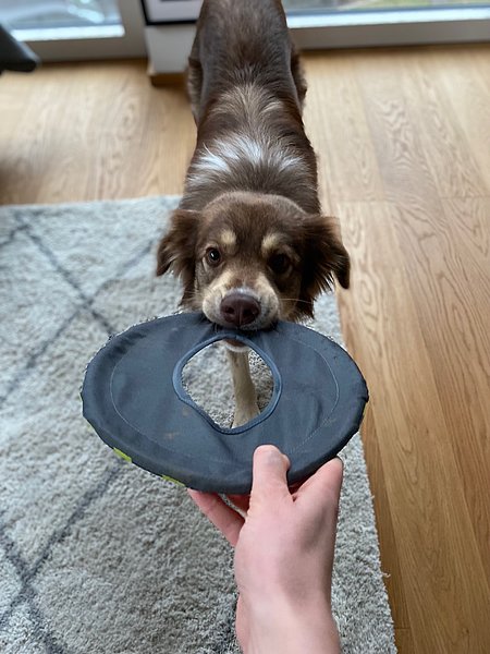 Ich bin super happy, weil ich als "sporty doggo" auch die ganze Zeit über Gelegenheit habe, zu raufen, zu rennen, zoomies zu drehen und in einer riesen Kiste Spielzeug zu wühlen. Wenn mir Frauchen und Herrchen versuchen, etwas zu erklären und bei zu bringen, dann versuche ich schon, sehr gut hinzu hören und zu verstehen. Das fällt mir natürlich noch ein bisschen schwer, weil ich noch sooo viel zu entdecken habe und jede noch so freche Fliege mich dabei manchmal ablenkt.