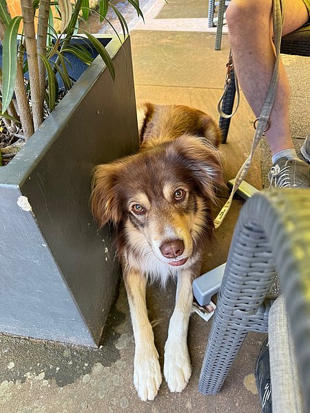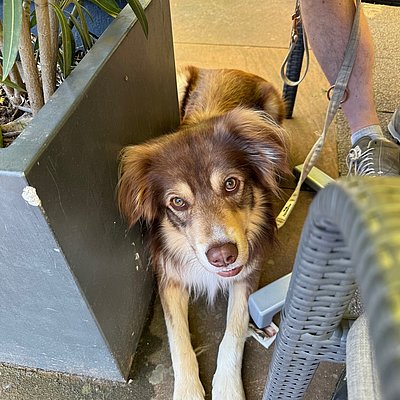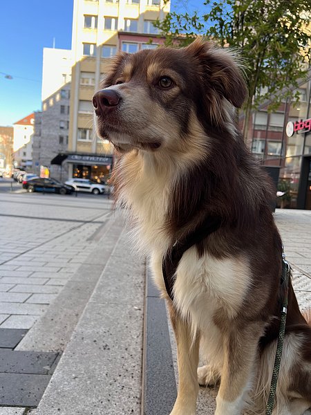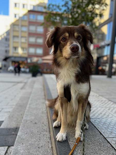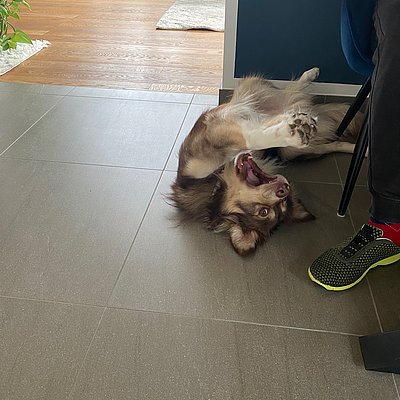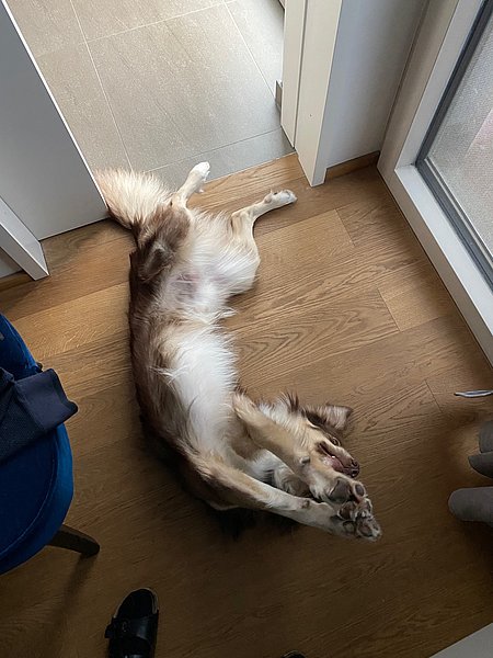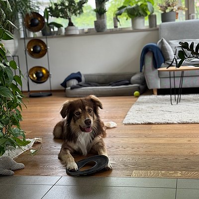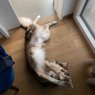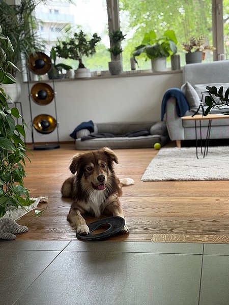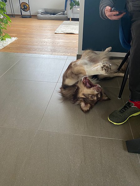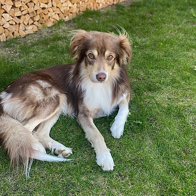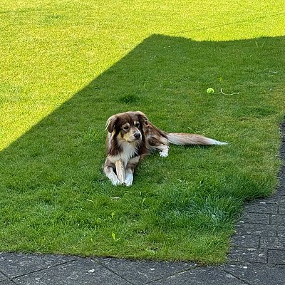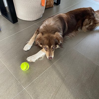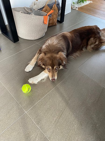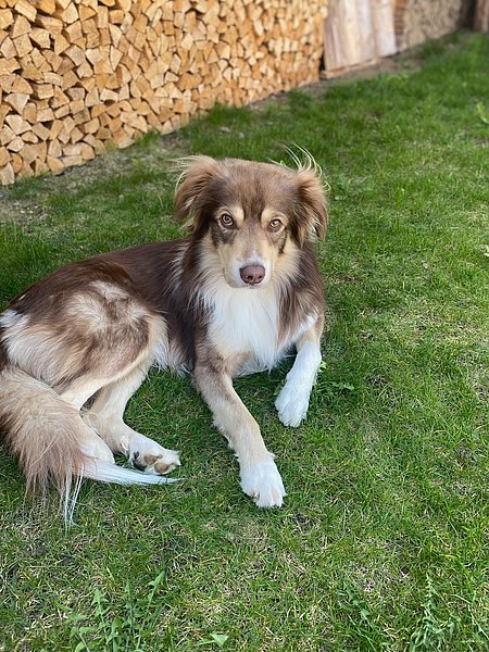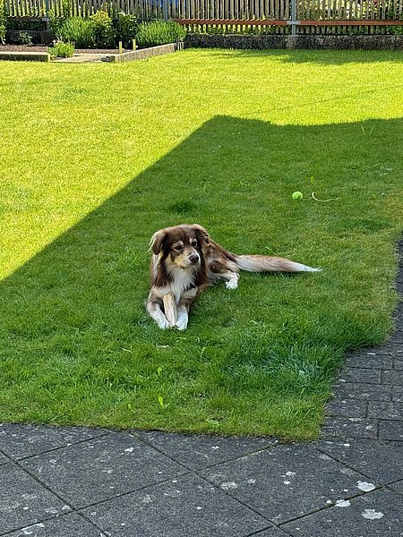 Ich bin total happy, weil mein Rudel zu jeder Zeit bei mir ist, mit mir lernt, mit mir spielt und mir viele neue Sachen beibringt. Ich hab leider immer noch ein bisschen Angst, dass man mich wieder verlässt und als Australian Shepherd passe ich natürlich auf alle und alles auf, den ganzen Tag und wenns sein muss auch in der Nacht.