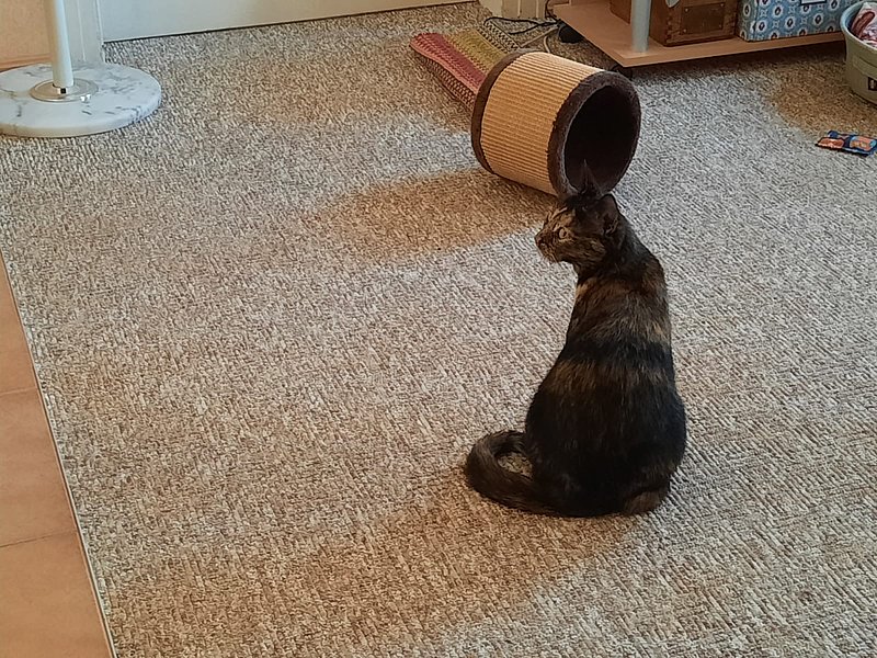 In meinem neuen Zuhause bin ich gleich aus dieser doofen Box raus, habe gefressen und mich ganz ausführlich in meinem Katzenzimmer umgesehen, alles da was ich brauche und ein paar Verstecke habe ich auch gleich gefunden und mich dann erst mal verzogen. Aber dann habe ich gemerkt, dass es hier so viel zu entdecken gibt und habe mein Versteck immer öfter verlassen. Am nächsten Tag durfte ich das ganze Haus erobern, bis zum Dachboden. Ich habe mir einen guten Schlafplatz gesucht und mich gründlich ausgeschlafen.