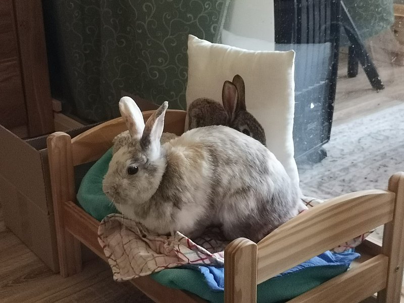 Meine Mamas haben mich Ende Juni zu sich nach Hause geholt, da ihr Widder Taya kürzlich seine Schwester Tael verloren hatte und leider ganz furchtbar traurig war. Am Anfang ging es erst mal einen Tag richtig rund! Aber das ist normal bei uns Kaninchen, wir sind zwar süß, können aber ganz knallhart die Rangordnung klären.