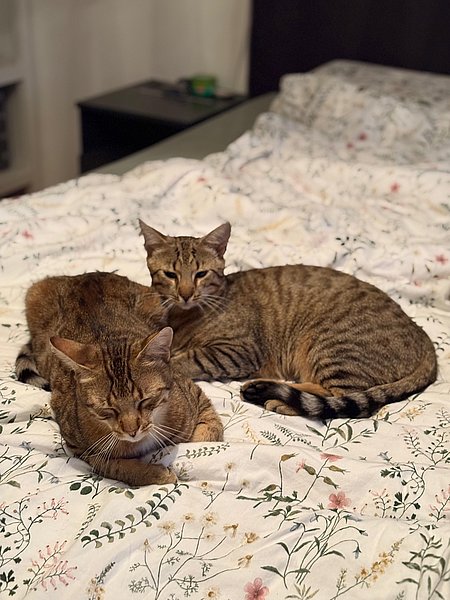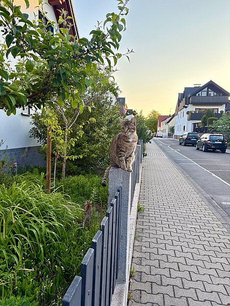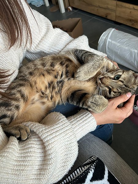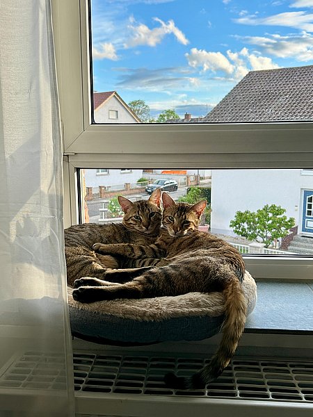 Es war wunderschön zu beobachten, wie Luke sich Tag für Tag ein kleines Stück mehr öffnete. Und eigentlich ging alles viel schneller, als wir erwartet hatten. Heute, nur wenige Monate später, sind beide fester Bestandteil unseres Alltags – und unseres Herzens. Jeden Morgen kommen sie zu uns ins Bett, kuscheln sich an und schnurren um die Wette. Das gemeinsame Schmusen ist mittlerweile ein festes Ritual geworden, das wir nicht mehr missen möchten. Auch draußen sind die beiden ein echtes Dream-Team: Luke ist der mutigere Kletterer, springt gerne und erkundet neugierig neue Höhen – und Lucky lässt sich gerne mitziehen. Dafür ist Lucky der soziale Part, der sich gerne Menschen nähert und sich streicheln lässt – und auch hier zieht er seinen Bruder liebevoll mit. Sie ergänzen sich perfekt.