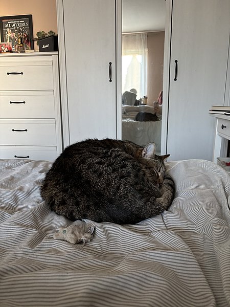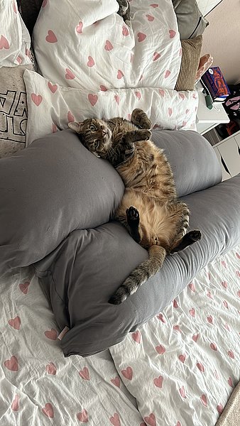 Die ersten Tage habe ich mich tagsüber unter einem Schrank versteckt, was sehr schwierig war, weil ich echt riesig bin. Ich hab mich immer richtig raus quetschen müssen. Allerdings habe ich schon in der ersten Nacht bei Mama und Papa im Bett geschlafen! Seitdem schlafe ich jede Nacht auf den Füßen von Mama.
