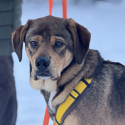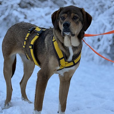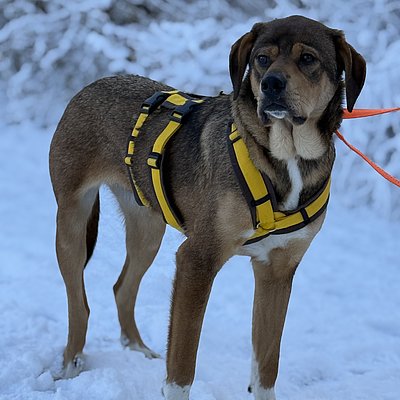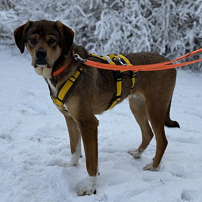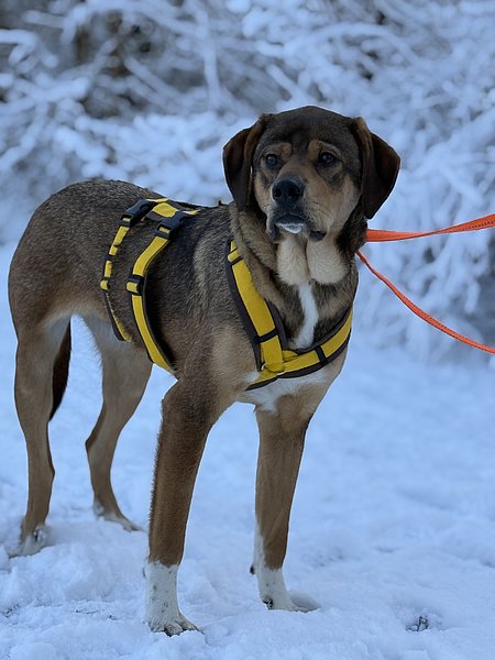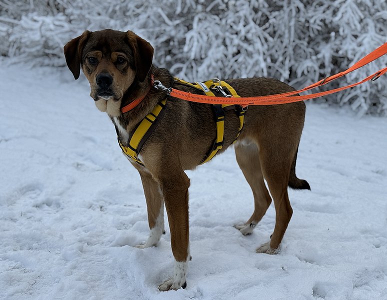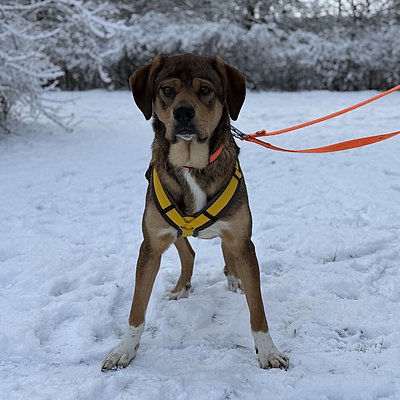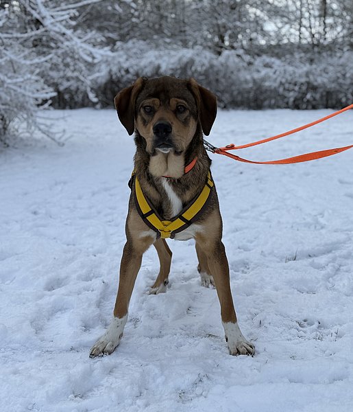 Ich kenne noch nicht viel von der Welt, aber ich bin neugierig darauf. Einige Situation erschrecken mich noch beim Gassi, daher trage ich ein Sicherheitsgeschirr. Diese Situationen kommen recht unvorhersehbar, daher solltet ihr auf jeden Fall die Leine immer fest bei euch haben. Der Besuch einer Hundeschule wäre super, denn da können wir gemeinsam das kleine und große 1x1 lernen. Ich bin gut verträglich mit anderen Hunden und werde gerne Zweithund. Etwas größere Kinder in der Familie wären auch kein Problem.