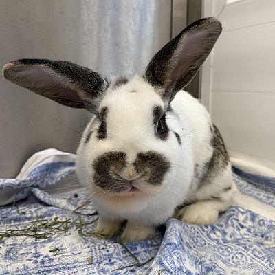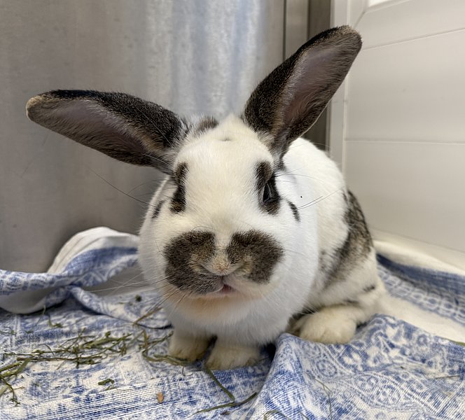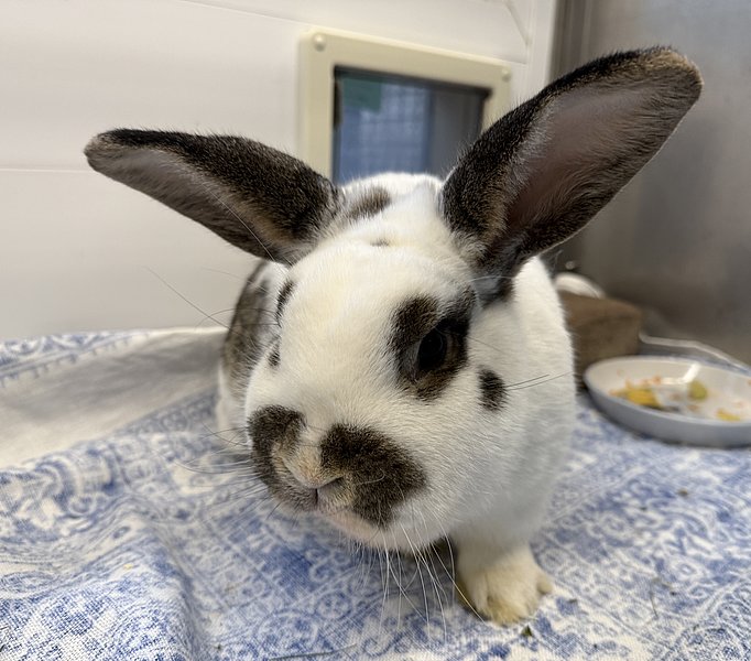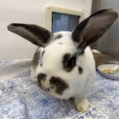 Spotty kam nun nach einigen Jahren wieder aus der Vermittlung zurück, da das Partnertier verstorben ist und die Besitzer mit der Kaninchenhaltung aufhören wollten. Spotty ist lieb, handzahm, verschmust, verfressen und verträglich mit Weibchen, aber nicht mit männlichen Kaninchen. Spotty hat keine Vorderzähne mehr, kommt aber super damit klar. Die Zähne mussten schon vor sehr langer Zeit wegen extremen Verwachsungen entfernt werden. Sein Grünfutter muss daher geraspelt werden.